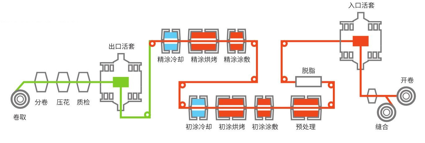 彩塗闆的生(shēng)産工(gōng)藝有很多,目前使用最多的是傳統的輥塗+烘烤工(gōng)藝,由于建築用塗層道次多以二塗爲多,因此,傳統的二塗二烘是最典型的彩塗生(shēng)産工(gōng)藝,彩塗機(jī)組的主要工(gōng)藝包括預處理(lǐ)工(gōng)藝、塗覆工(gōng)藝、烘烤工(gōng)藝。