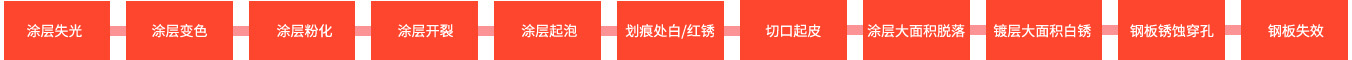 彩塗鋼闆的時效過程如(rú)上圖所示,塗層失效、鍍層失效乃至鋼闆穿孔是關鍵的腐蝕發生(shēng)過程。因此提高塗鍍層厚度,且采用耐候、耐蝕塗鍍層是最有效的防止彩塗鋼闆腐蝕失效的手段。
