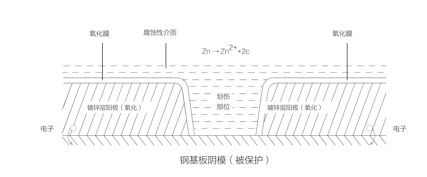 陰極保護:鋅層某處被劃傷,周圍的鋅會先融化變爲鐵的替身(shēn),保護裸露鋼材不受腐蝕。